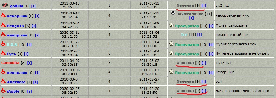 Во-вторых, большие изменения претерпела Хеленка - она стала 9 уровня, и ее нет в клане MIBвыгнали из клана. Зато она, как видно на скрине ниже, когда-то успела побывать в админке и пересажать кучу народу.