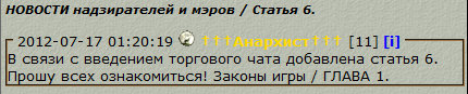 6.2 Торговый чат предназначен для рекламы услуг (смотри статью 6, пункт первый), сообщения не по теме, будут наказываться арестом 1 степени сроком на 15 минут